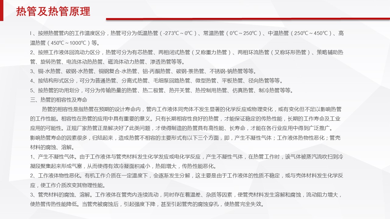 l 、按照熱管管內(nèi)的工作溫度區(qū)分,熱管可分為低溫?zé)峁埽?273℃~0℃)、常溫?zé)峁埽?℃~250℃)、中溫?zé)峁埽?50℃~450℃)、高溫?zé)峁埽?50℃~1000℃)等。