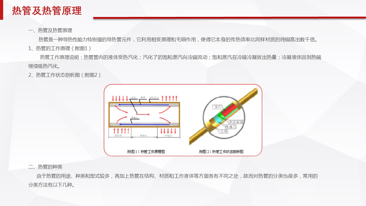 熱管工作原理說明:熱管管內(nèi)的液體受熱汽化;汽化了的飽和蒸汽向冷端流動;飽和蒸汽在冷端冷凝放出熱量;冷凝液體回到熱端繼續(xù)吸熱汽化。